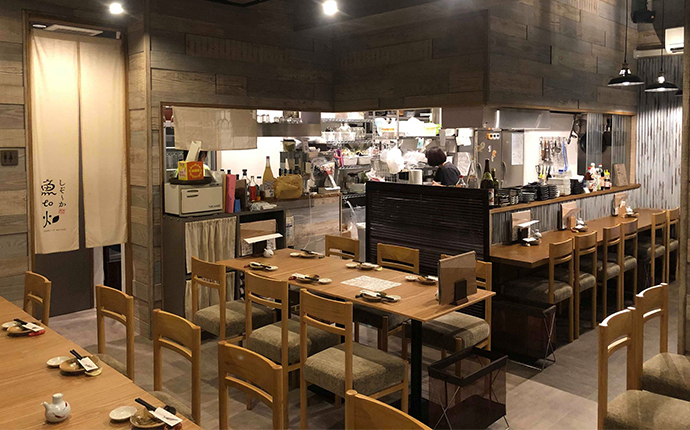 カウンター、テーブル、掘りごたつ座敷などカップルから宴会まで幅広く対応。