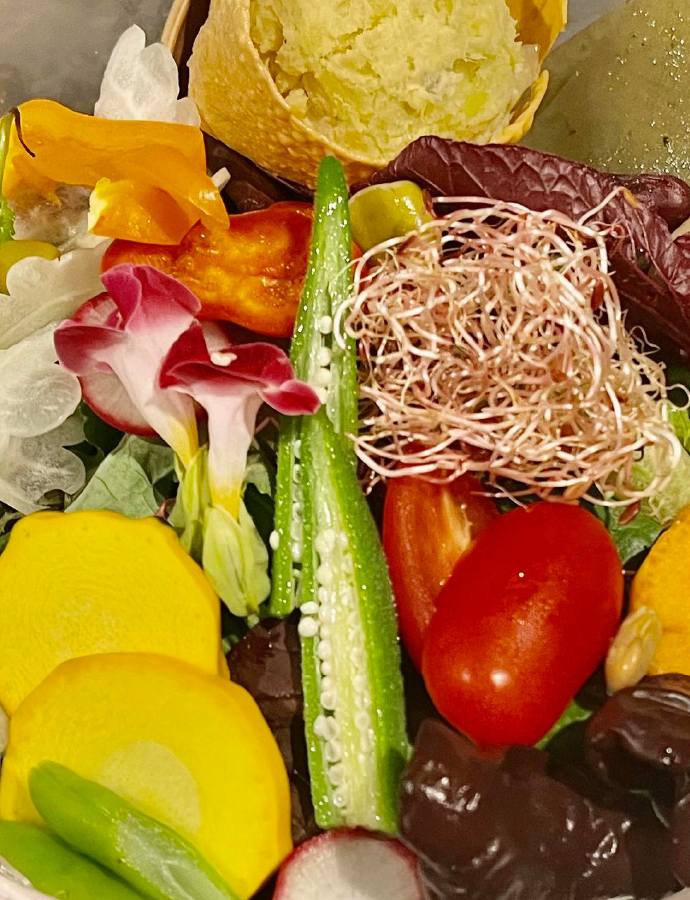 食前に、スムージーや加熱してない食材など小鉢2種、非加熱の食材で酵素をとり、消化、吸収、代謝を助けます。